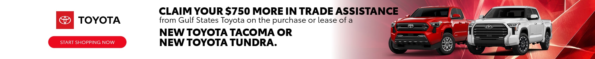 $750 Trade-In Assistance offered by Gulf States Toyota, Inc. Offer must be applied towards new 2024 or 2025 Tundra or Tacoma vehicle purchase or lease transaction from dealer in-stock inventory with the trade in of any vehicle. Offer excludes TRD Pro 8424. Must finance or lease through your dealer and Toyota Financial Services to qualify for cash and cash must be applied as capitalized cost reduction on lease or down payment on finance. There is no cash back option. Lease terms on approved credit. Not all customers qualify. Proof of ownership or eligibility must be presented to the dealer at the time of purchase or lease to be honored. Non-transferable. Limit one per vehicle. Cannot be combined with other offers. Other limitations may apply. See dealer for details. Expires 9/2/2025.